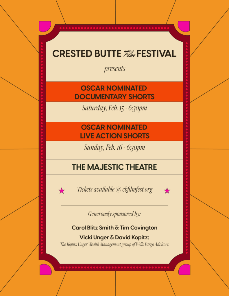 Join Crested Butte Film Festival, for the seventh year in a row presenting two Oscar Nominated Short Film programs over two nights. In each program, you’ll see the five finalists in each category and one of them will win the Oscar at The Academy Awards on March 2nd. These are considered the best short films in the world, so please come out and see what these talented filmmakers have come up with. The films are intended for mature audiences.